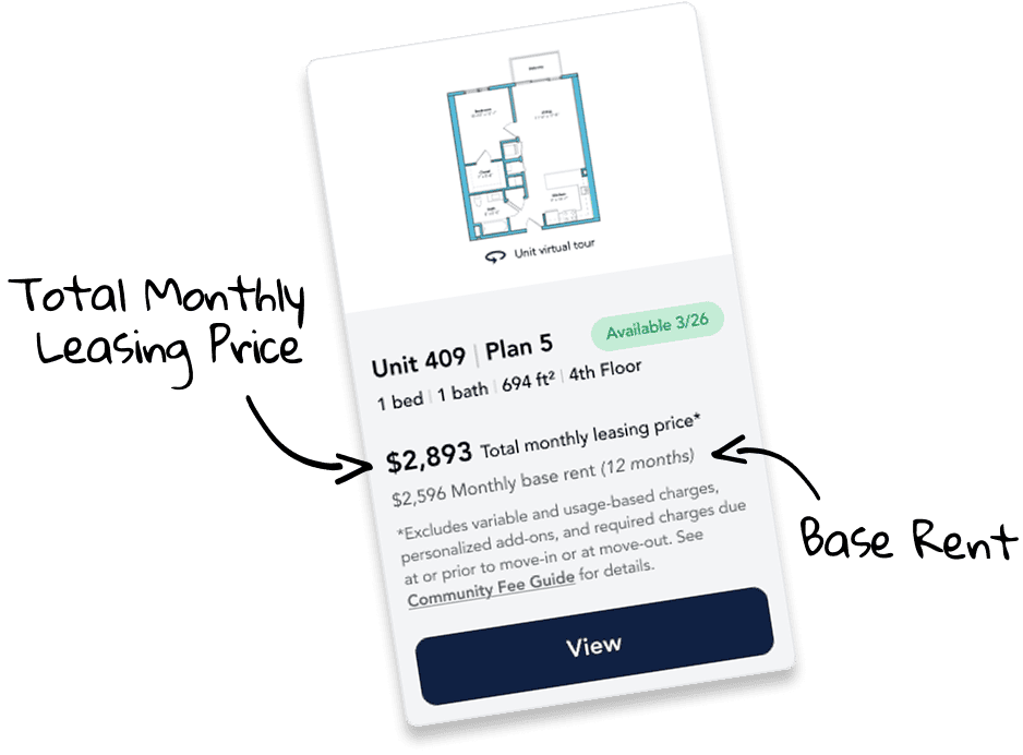 Planning your budget is essential, and we’re here to make it simpler. Our Total Monthly Leasing Price reflects all fixed, mandatory fees alongside your base rent, giving you a complete picture of your monthly costs. To customize your Total Monthly Leasing Price and plan with confidence, use our Calculate My Costs tool found within the Map view. We’ve also provided a list of all potential fees you may encounter as a resident, which can be found at the bottom of the page.